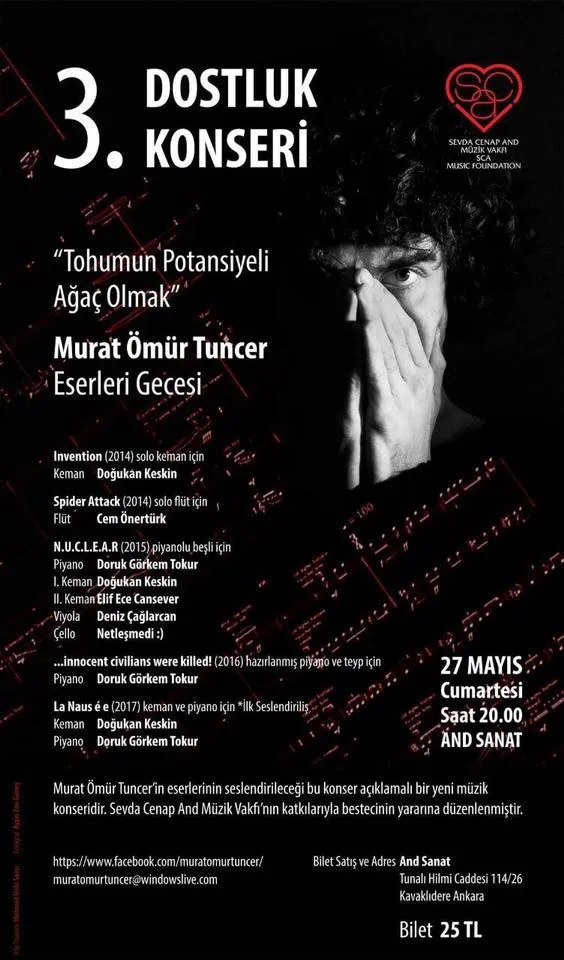 Sevda Cenap And Müzik Vakfı’nın mekan desteğiyle bestecinin dostları tarafından bestecinin yararına düzenlenen konser 27 Mayıs Cumartesi günü, saat 20.00’de, (Tunalı Hilmi Cad. No: 114/ 26 - 1.Kat) And Sanat ‘ta.
